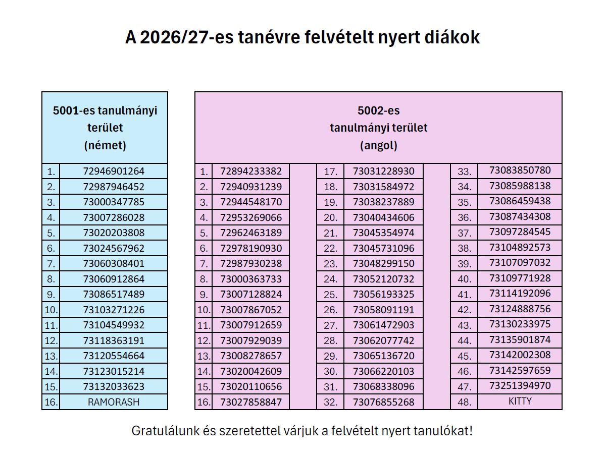 Ide vagy a képre kattintva megtekinthető a 2026/27-es tanévre felvételt nyert tanulók listája.